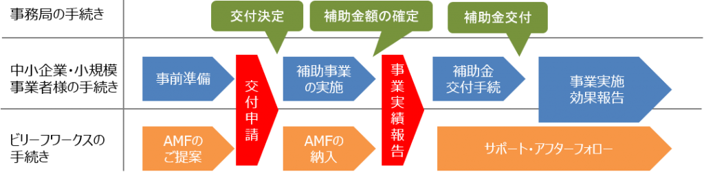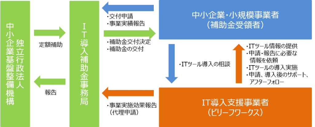 中小企業・小規模事業者等のみなさまとIT導入支援事業者である弊社で、行う申請・手続きの概要は以下の通りとなります。
