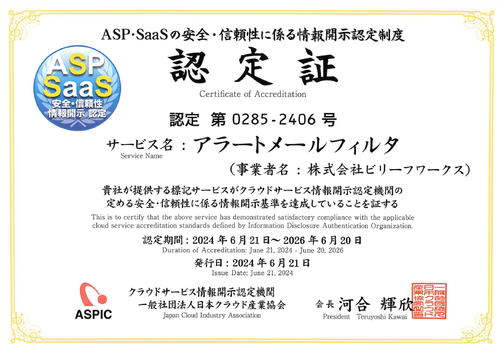 ・日本クラウド産業協会(ASPIC)「情報開示認定制度」認定サービス